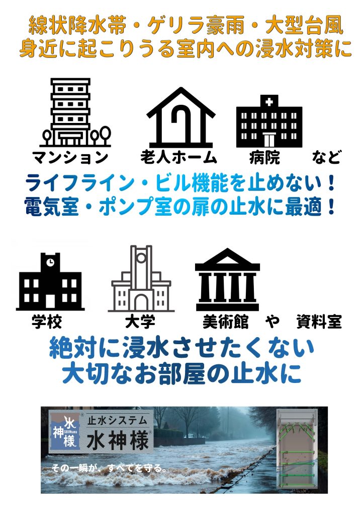 ビル・マンションにとって大切な 電気室・ポンプ室を守る。扉の止水「水神様®」